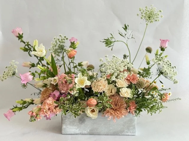 Our take on a classic design. This arrangement sits a little taller and features a floral heavy seasonal color palette.